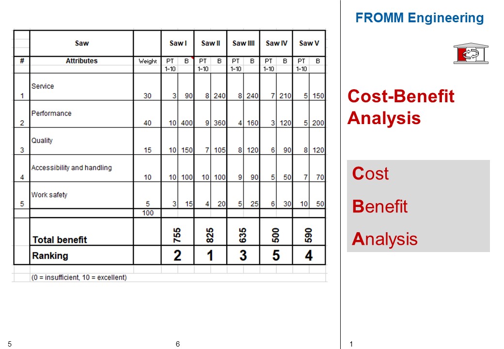 The Cost-Benefit Analysis is a methodology that should rationally support decision-making in complex problems. The CBA is a relatively old method that has its origins in the economic "utility analysis". In German-speaking countries it became known through Zangemeister (1976).