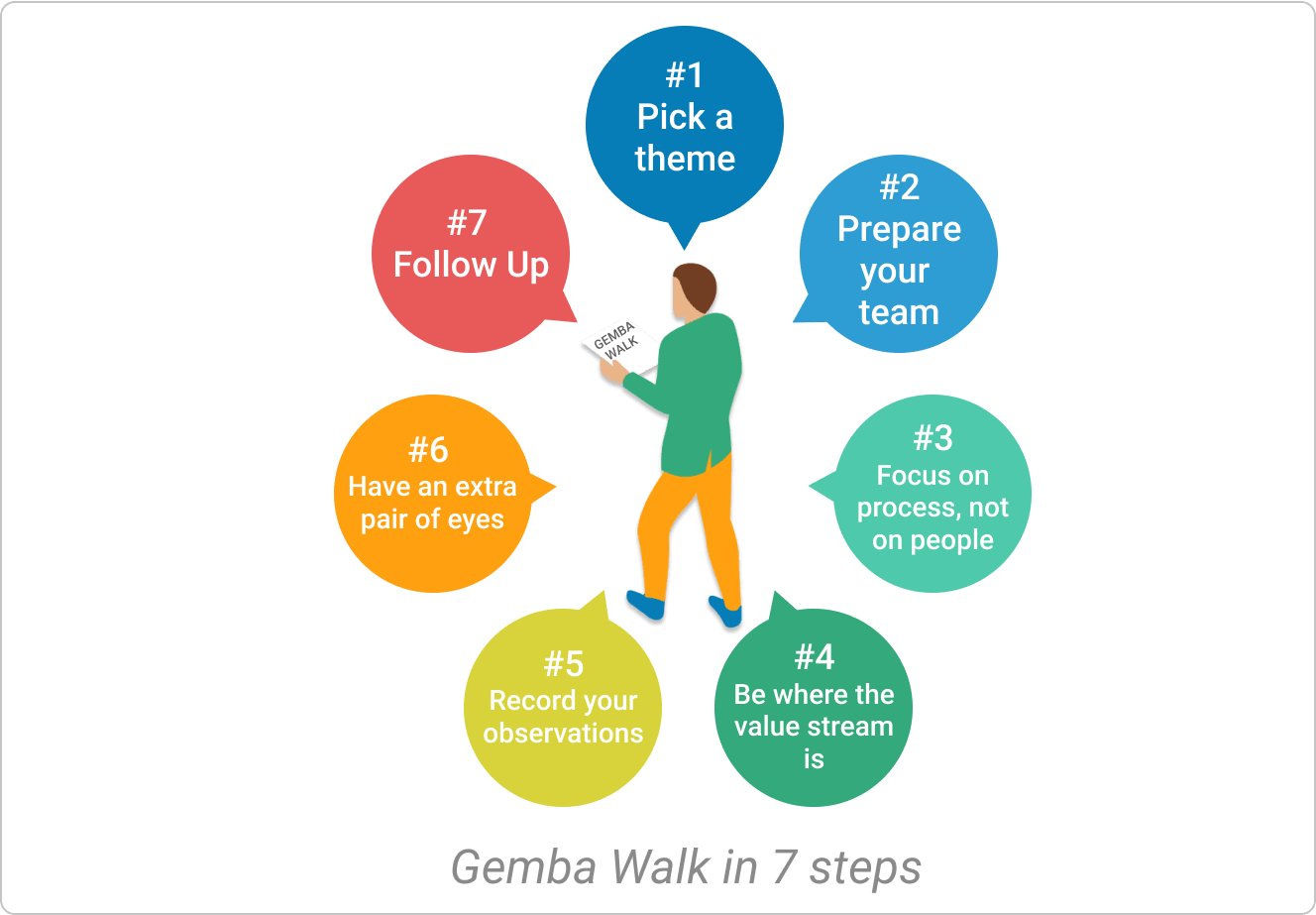 1. Go and see. The main idea of the Gemba walk is managers and leaders on every level to take regular walks around the shop floor and to be involved in finding wasteful activities.