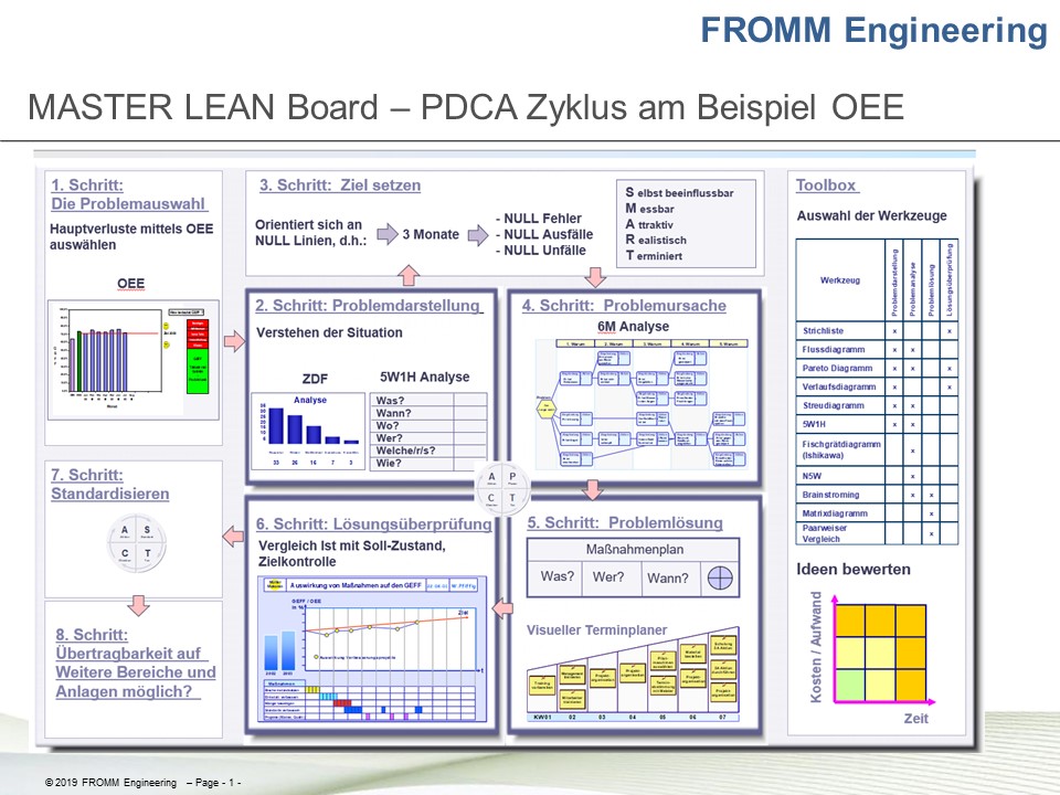 The PDCA cycle, on the other hand, ensures an ongoing process of improvement and can be used in different areas. It helps to analyze situations, to identify potentials and to derive actions and possibilities for optimization. You can see this in the example MASTER LEAN Board – PDCA Zyklus am Beispiel OEE